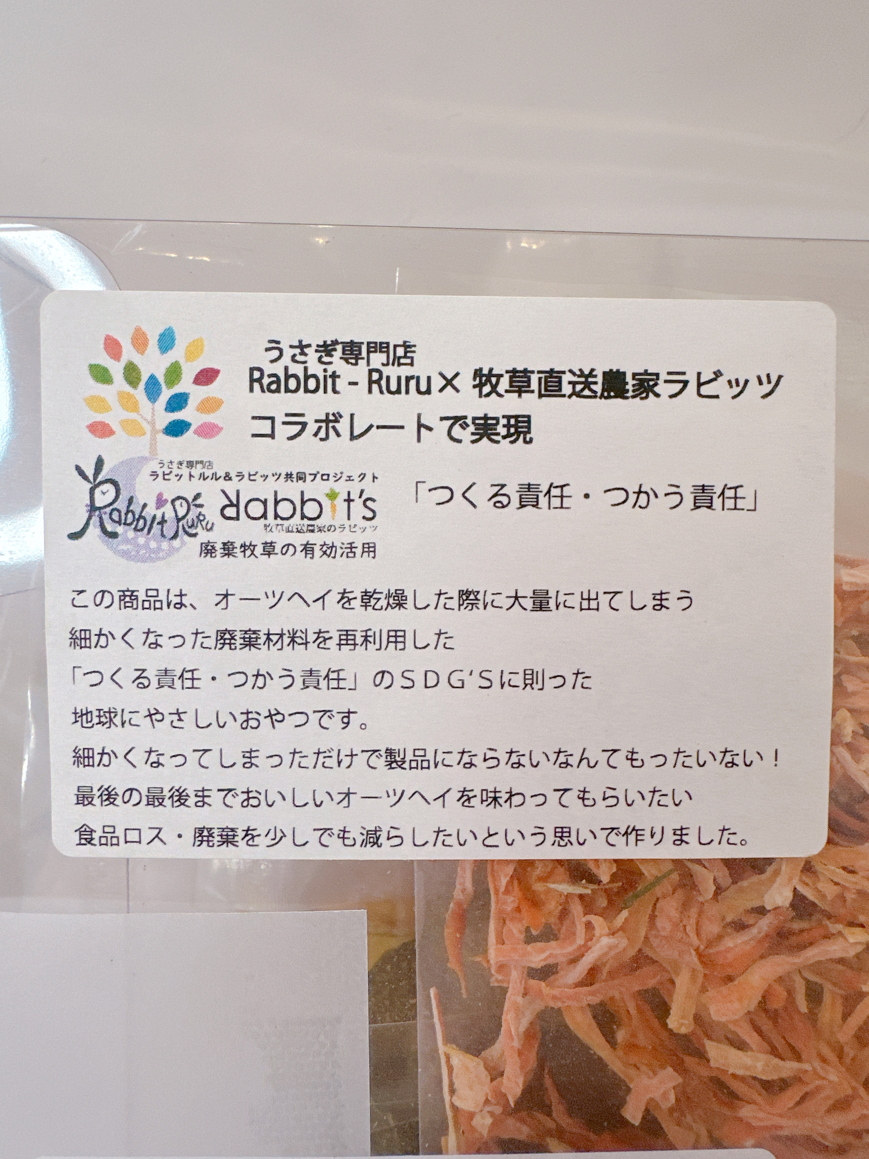 この商品は、うさちゃんのおやつに使用される、国産無農薬オーツヘイやにんじんを、乾燥した際に大量に出てしまう、細かくなった廃棄材料を再利用した